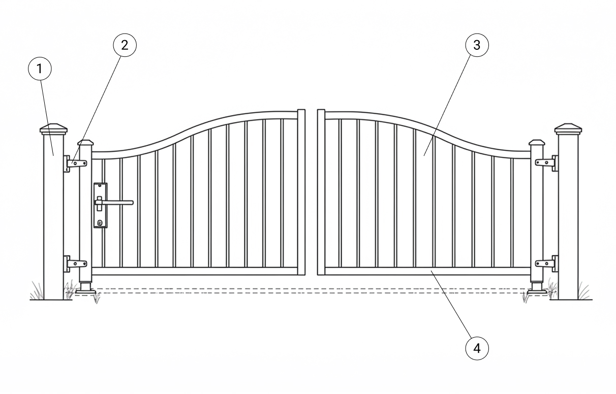 Изделия выполняют из каркаса, столбов, и наполняют створки заказанным заказчиком материалом. Каркас изготовлен из трубы прямоугольной или квадратной. Для столбов подходит профиль 100х100 мм или 80х80 мм.
